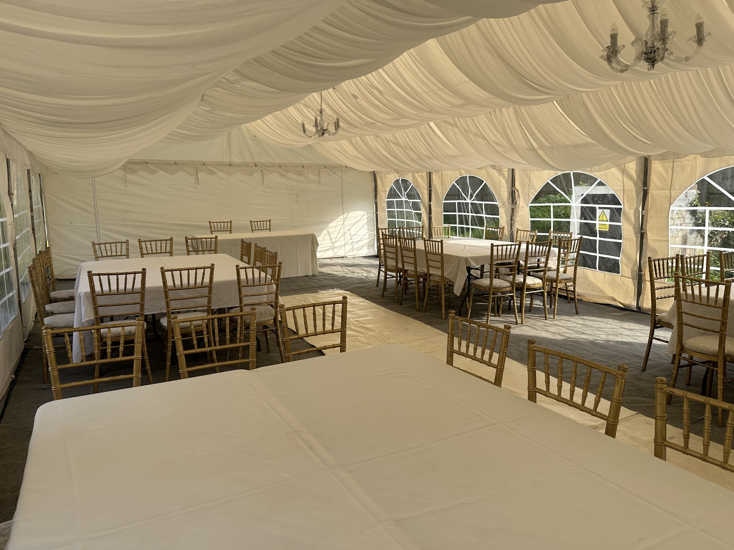 Transform any event into a sophisticated occasion with our elegant white marquee adorned with sparkling crystal chandeliers. Ideal for weddings, receptions, and gala dinners, the marquee provides a spacious and stylish environment. Full delivery, setup, and dismantle services are included for your convenience. Add personalized touches with bespoke décor and lighting options to create a memorable ambiance.